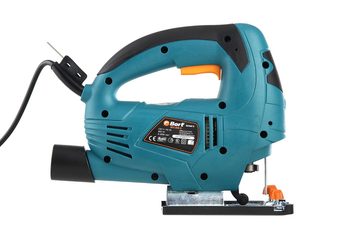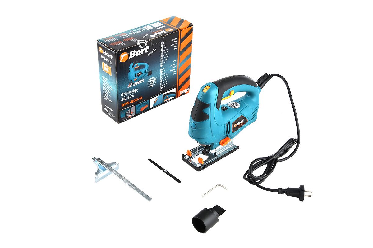 Лобзик BORT BPS-800-Q — лобзик маятниковый. Используется для работ по дереву, металлу, пластику. Инструмент выполняет прямолинейные и криволинейные пропилы. Мощность — 800 Вт. Число оборотов — до 3000 об/мин. Максимальная глубина распила дерева — 80 мм, металла — 10 мм.