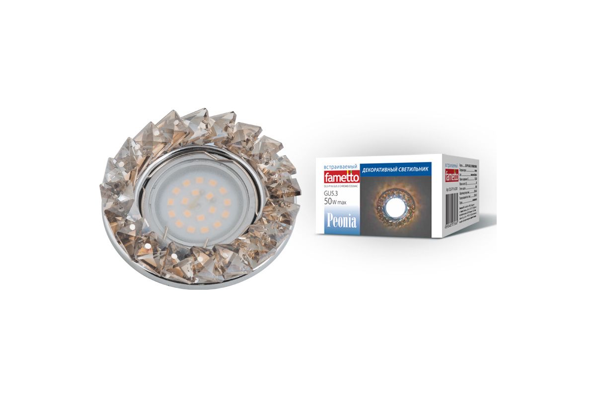 DLS-P116 GU5.3 CHROME/COGNAC Светильник декоративный встраиваемый ТМ ''Fametto'', серия ''Peonia''. Без лампы, цоколь GU5.3. Основание металл, цвет хром. Отделка стекло, цвет коньячный.