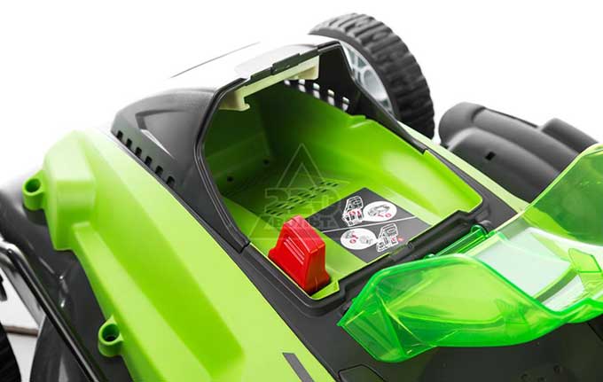 - По мере разряда аккумулятора мощность не падает. Газонокосилка работает эффективно все время.