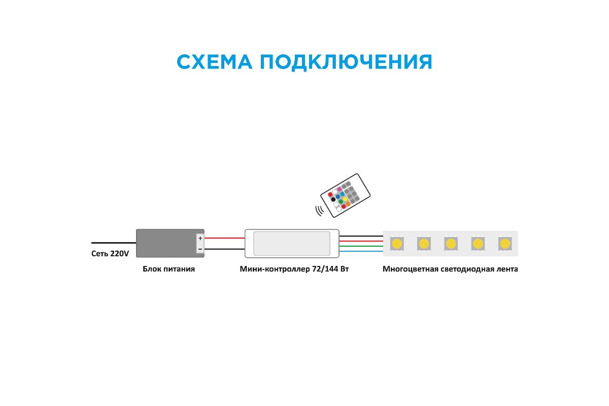 Важно отметить, что в зависимости от того с каким напряжением предстоит работать устройству, будет отличаться и максимальная мощность нагрузки, которую можно подключить к нему. Так, при напряжении 12 В максимальная нагрузка будет равна 72 Вт, а при напряжении 24 В уже 144 Вт. Это значит, что к данному изделию вы можете подключить в два раза больше светодиодной ленты 24 В. Контроллер укомплектован дистанционным пультом управления, передающим сигнал по радиоканалу, благодаря чему сам контроллер можно спрятать из зоны видимости, и он будет также качественно принимать сигнал от пульта и управлять светодиодной лентой. Управление осуществляется с помощью кнопок, расположенных на лицевой стороне пульта, который работает от 1-й батарейки CR2025. Накладной корпус контроллера, выполненный из пластика , благодаря миниатюрному размеру 50х13х4 мм, позволяет разместить его даже в профиле для светодиодной ленты. Степень защиты от пыли и влаги соответствует стандарту IP33, что подразумевает установку устройства в сухом, проветриваемом помещении.